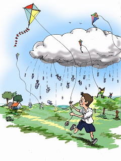 Y de repente... salió el Sol entre las nubes, era “agua con sol”, iluminó el llano, y junto a la lluvia comenzaron a caer sardinas del cielo... y la gente corría como loca a recogerlas, olvidándose de nosotros y de las cometas... y el Sol regresó, iluminando la tardecita del llano, hasta el ocaso. La multitud no abandonó hasta bien entrada la noche, entre risas y comentarios, el llano del matadero... Mi mensaje había llegado a su destino.